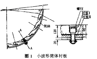 在簡體橫斷面上,沿筒體圓周有24塊小波形襯板一塊壓著一塊,格子型球磨機每塊用2只M36螺釘與筒體固定,相鄰倆塊在筒體長度方向上的間隙錯開,格子型球磨機通過長期對其使用和失效情況的考察發(fā)現(xiàn),失效報廢幾乎都是因螺釘松動引起格子型球磨機筒體漏砂。