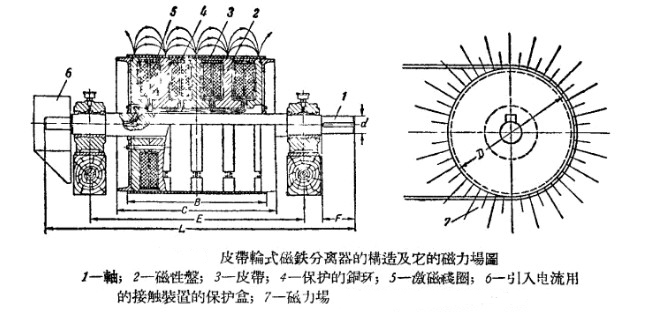 在皮帶輪式分離器內(nèi),沿著輪子的轉(zhuǎn)動(dòng)其表面會(huì)產(chǎn)生強(qiáng)大的磁場(chǎng),在較小直徑處的磁場(chǎng)達(dá)到750-900奧斯特,較大直徑處磁場(chǎng)達(dá)到1200-1400奧斯特,當(dāng)即將進(jìn)行球磨機(jī)粉碎的物料內(nèi)金屬塊落到這個(gè)磁場(chǎng)時(shí),就會(huì)被吸進(jìn)并貼在筒上,然后脫落而被皮帶擲落到分離器下方的特殊卸斗內(nèi)。其具體結(jié)構(gòu)如圖: