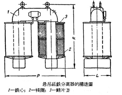 球磨機(jī)運(yùn)轉(zhuǎn)中所用的懸吊磁鐵分離器則主要由一些馬蹄形的鐵心構(gòu)成,其上繞有線圈,而下段裝有的端部。經(jīng)過此設(shè)備分離出來的金屬塊會(huì)在人工作用除去,具體結(jié)構(gòu)如下: