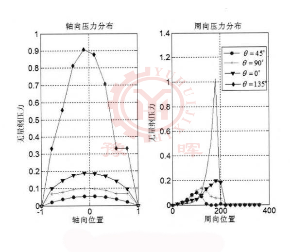 由不同旋轉(zhuǎn)角度下的球磨機(jī)橢圓軸處的油膜厚度分布情況我們可以知道,隨著橢圓的長軸圍繞主軸軸心做逆時針運(yùn)轉(zhuǎn),此時的動靜壓軸處油膜厚度也會發(fā)生一定的變化,而較小油膜的厚度則是先增加后減小然后在增大的變化。同時我們還可以了解到球磨機(jī)油膜厚度會有兩個較低谷出現(xiàn),這些低谷則意味著動壓油楔的產(chǎn)生,同時此區(qū)域也是我們所稱的動壓力區(qū)。